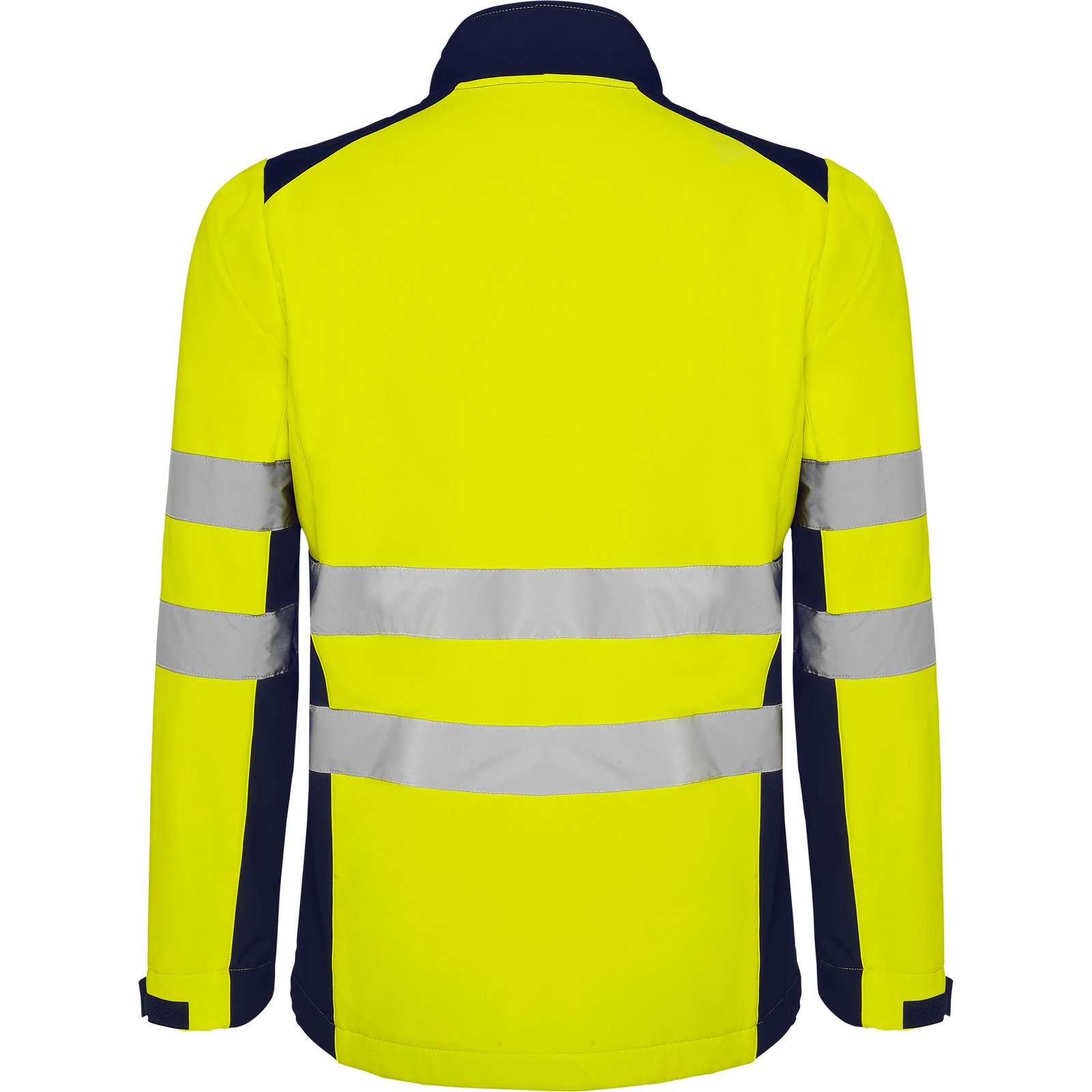 Softshell bicolor de alta visibilidad resistente al agua, tejido interior suave de alta capacidad térmica. · Cuello alto, cierre central con cremallera invertida. · Dos cintas reflectantes en torso y mangas. · Tres bolsillos exteriores. · Goma en el interior de la…