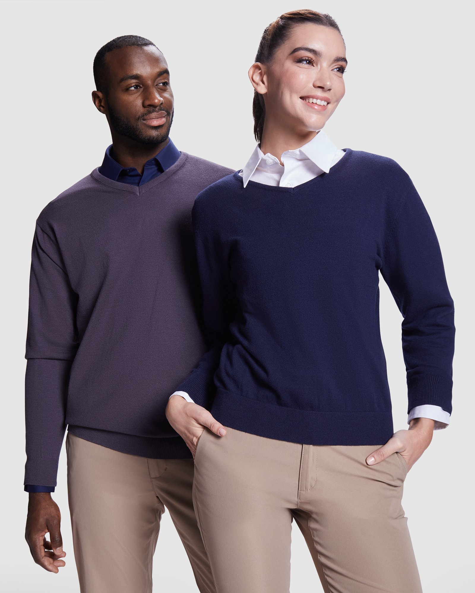Jersey de mujer con escote de pico en punto fino. Acabado en punto de canalé 1x1 al tono en escote, puños y bajo.Composición: 50% viscosa / 28% poliéster / 22% poliamida, GG12