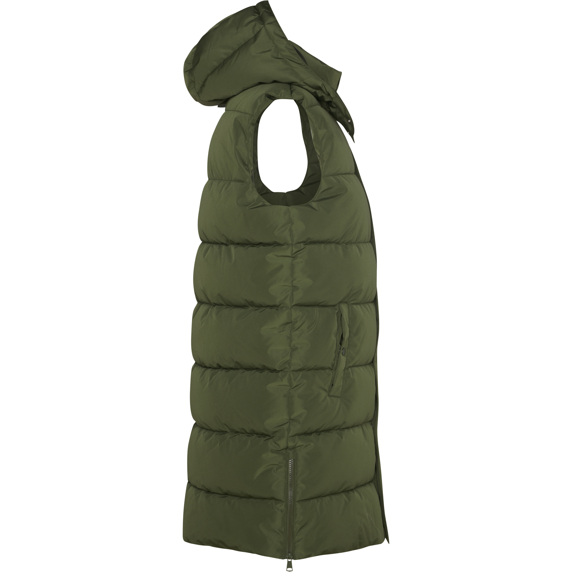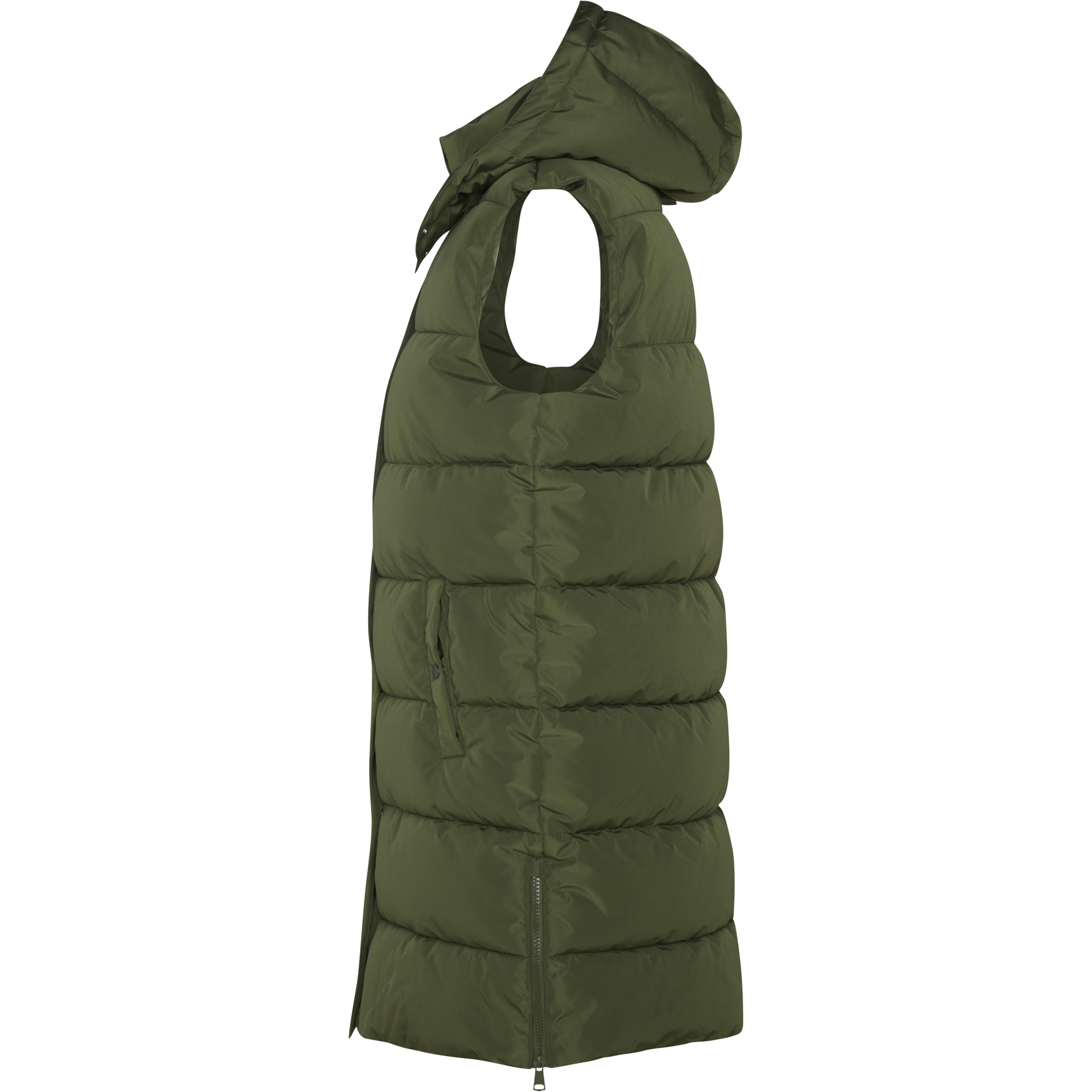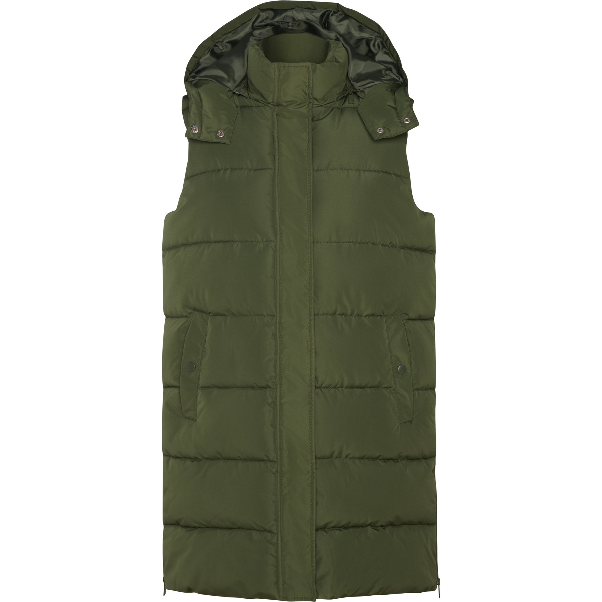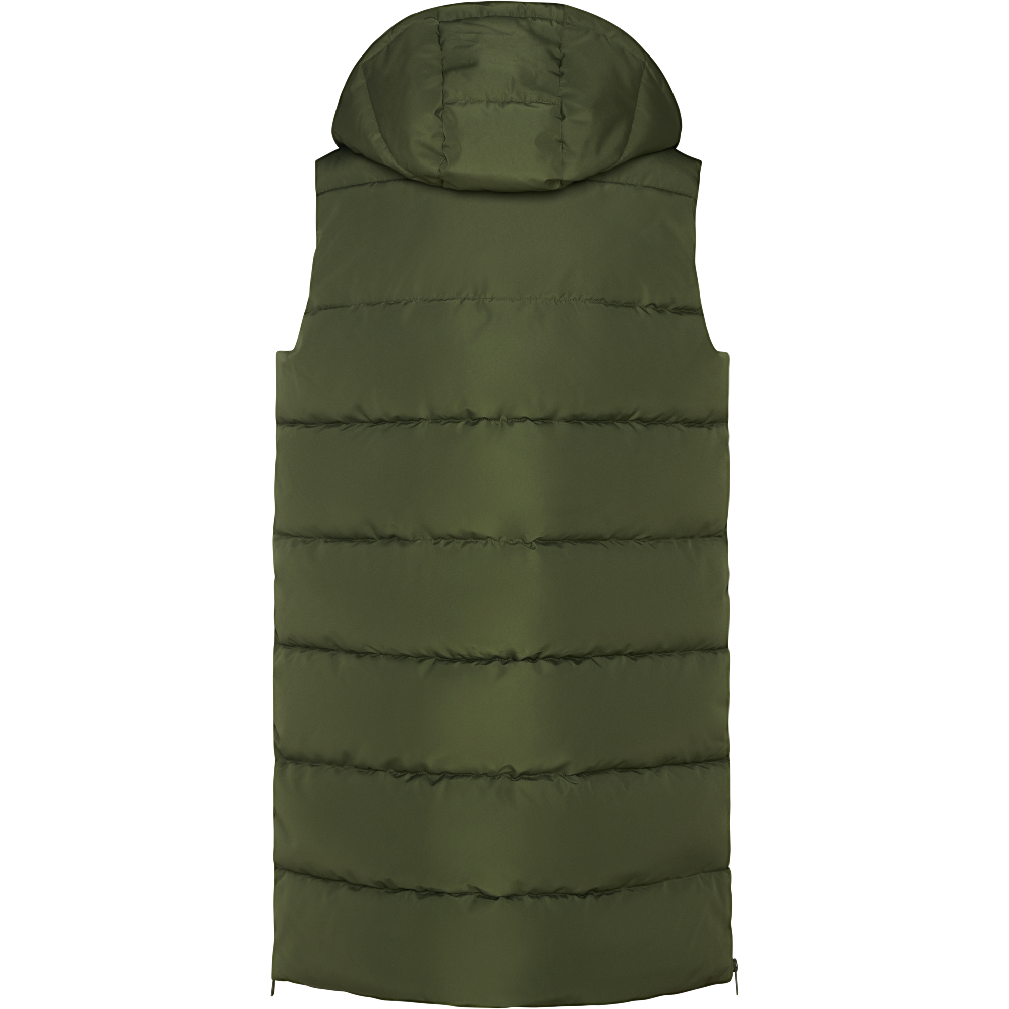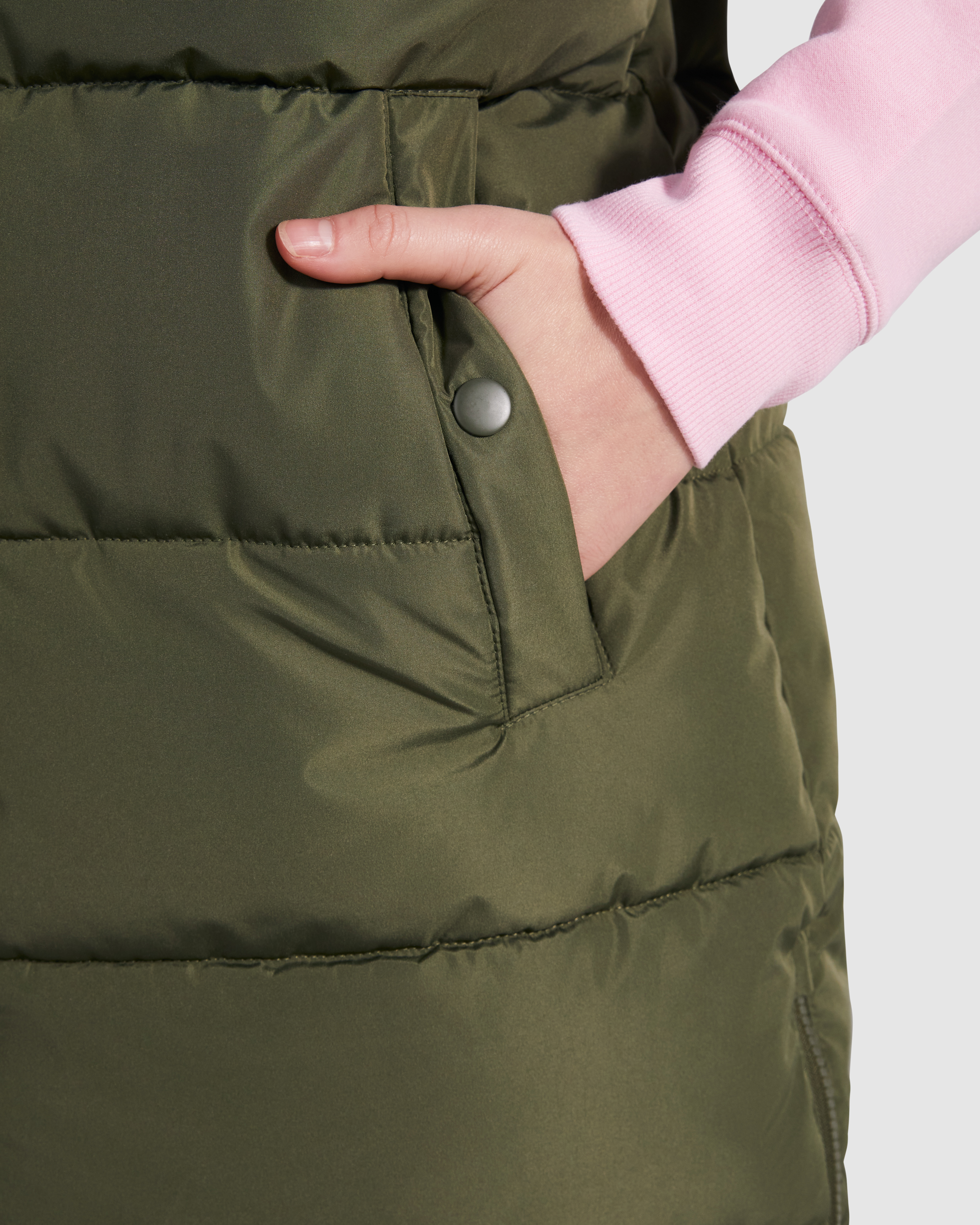 Chaleco acolchado de mujer con capucha extraíble. Cuello alto. Cierre frontal con cremallera oculta por solapa. Dos bolsillos con cierre de botón a presión. Aperturas laterales con cremalleras. Acceso interior en pecho para reprocesos. Composición: Tejido Exterior: 100% Poliéster Guata: 100% Poliéster…